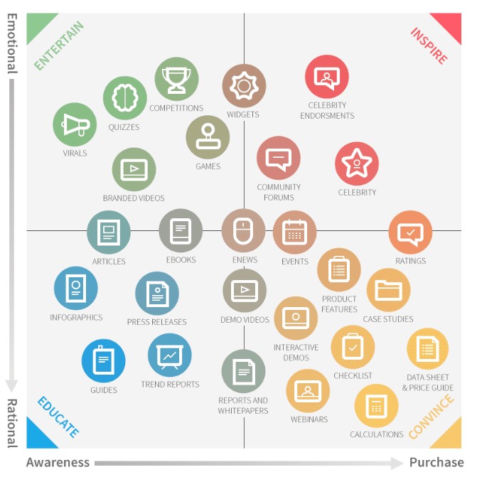 La team KHOSI vous conseille d’ailleurs la matrice du Content Marketing Ă©ditĂ©e par Smart Insights si vous cherchez des idĂ©es de contenus (nous nous en sommes servi pour le benchmark) :
