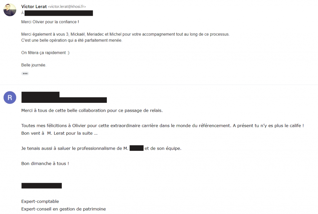 Cette reprise ne pouvait pas se faire dans de meilleures conditions. Tant du côté d’Olivier que de KHOSI, les échanges ont été fluides, toujours avec le sourire et la confiance. Même les avocats sont contents ! Voici la réponse de l’avocat d’Olivier, suite au mail de Victor, à la fin de l’opération :