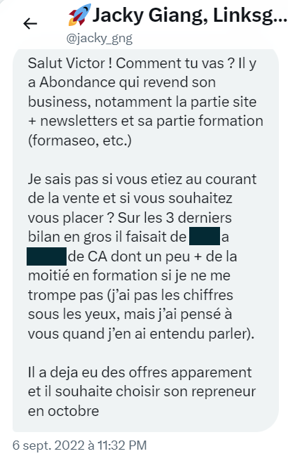 Malheureusement, le montant proposé est vraiment très en-dessous de ce qui est proposé par les autres « prétendants ». Pour être très transparent, le montant proposé « ailleurs » oscille pour tout le monde entre X et X k€, hors trésorerie, bien sûr.