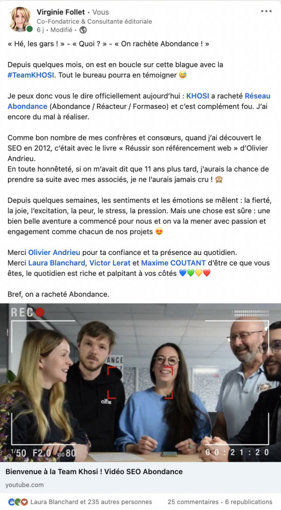 L’excitation est à son comble ! Laura et Victor se rendent au bureau dès 7h du matin pour transmettre le communiqué de presse aux médias (un bon gros flop 😄). 9h01, Olivier poste la vidéo d’annonce sur ses réseaux, on relaie sur nos profils sociaux pro et perso. Un e-mailing à chaque partie prenante est envoyé : les clients de KHOSI, les clients d’Abondance, les formateurs Formaseo, les équipes techniques.